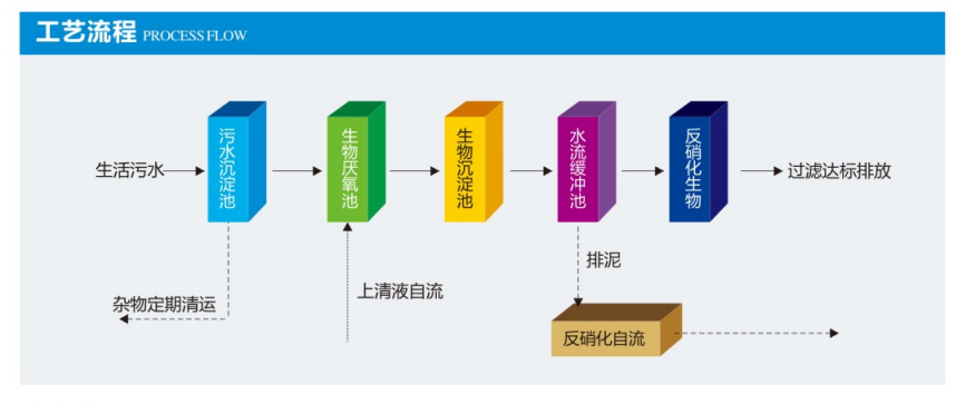 生活污水中有机类杂质较多,CODcr、BOD5均较高,且BOD5/CODcr之值大于0.4,生化性能较好。因此宜采用以生化为主的工艺处理流程。因污水水量较小,生化设备采用地埋式自流反硝化污水处理设备较为适宜。在进生化装置前,尽可能在预处理阶段(污水储水池)将生活污水中漂浮和大颗粒悬浮杂质去除。